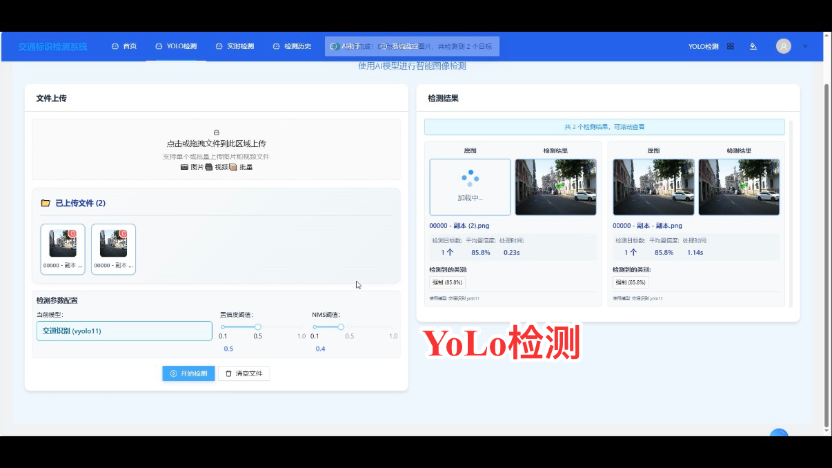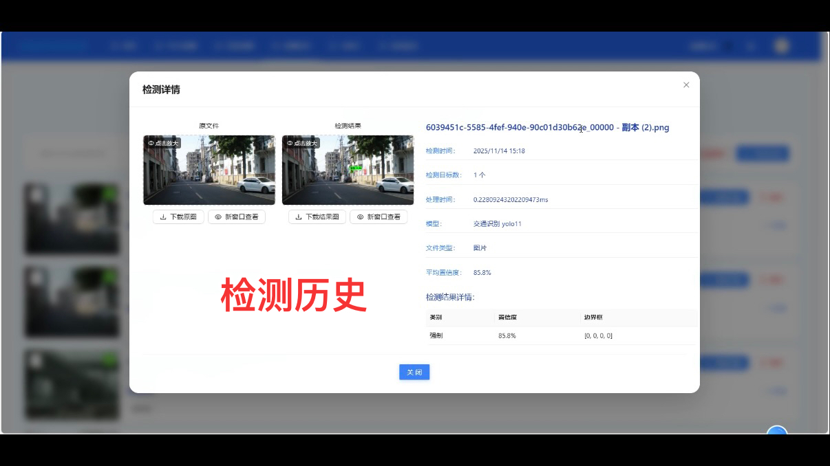 - 离线检测:用户上传本地视频或图像文件,系统通过 FFmpeg 处理视频流,结合 YOLO11 模型完成批量检测,生成检测报告(含标识类型、位置、置信度等信息);