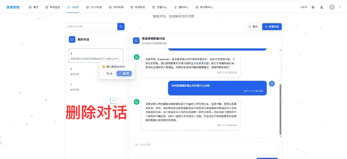 - 操作步骤 2(删除):点击会话 “删除” 按钮,确认后删除当前会话及所有对话记录;