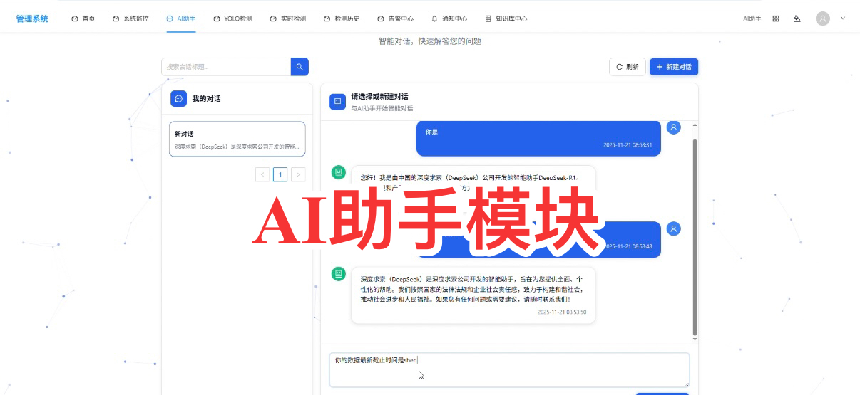 - 操作步骤:点击 “新建对话” 按钮,输入提问(如 “你是”“你能为我做什么”“数据最新截止时间”),等待 AI 回复;