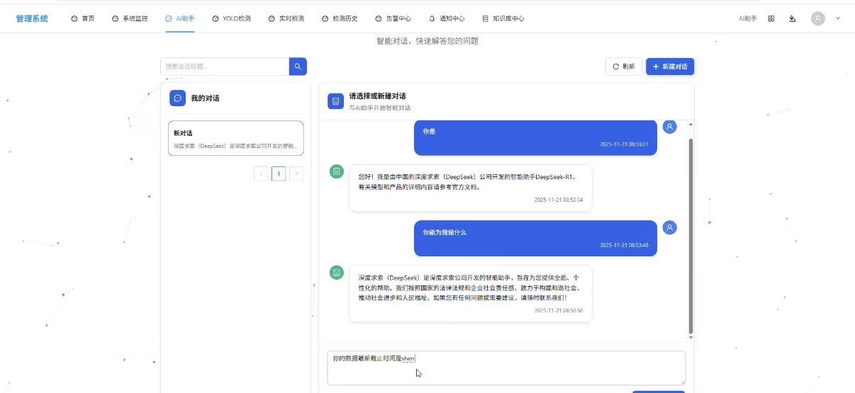 - 效果:输入 “你是” 时,AI 秒级返回身份定位;追问 “能做什么” 时,清晰罗列功能清单;查询 “数据截止时间” 时,准确返回预设时间节点,无明显延迟。