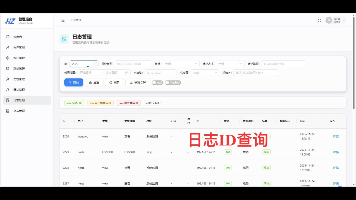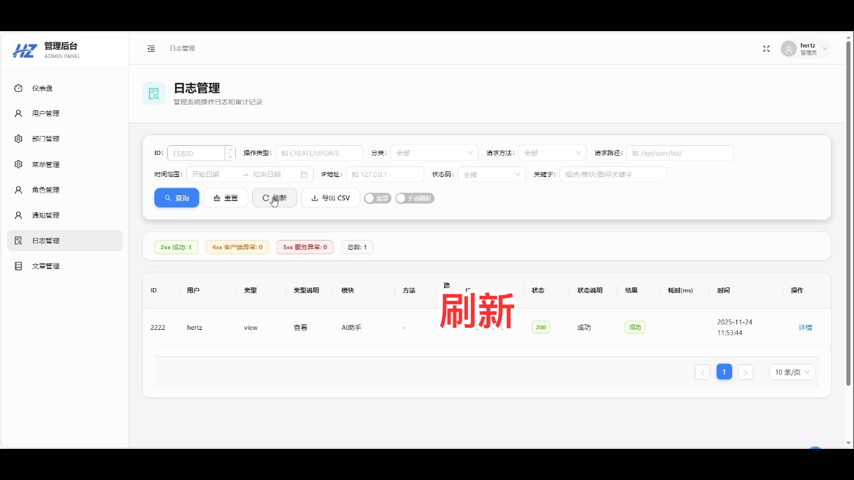 本日志管理模块的操作流程遵循 “精准查询 - 详情追溯 - 全量查看 - 离线导出” 的逻辑,覆盖日常开发中的核心使用场景。操作步骤简洁无冗余,同时结合 Redis 缓存、TypeScript 类型校验等技术确保功能稳定性,可直接作为管理系统的通用模块复用,尤其适合毕业设计、企业内部系统开发参考。