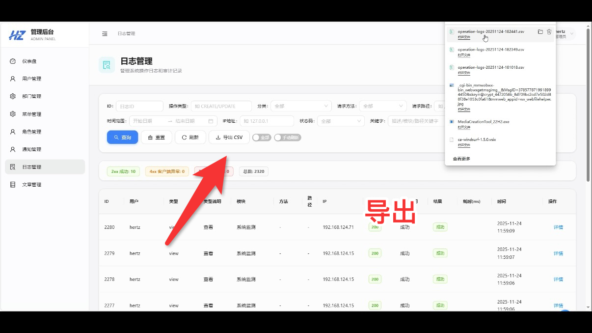 - 操作步骤:在日志列表页点击 “导出 CSV” 按钮,系统会自动触发下载;