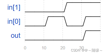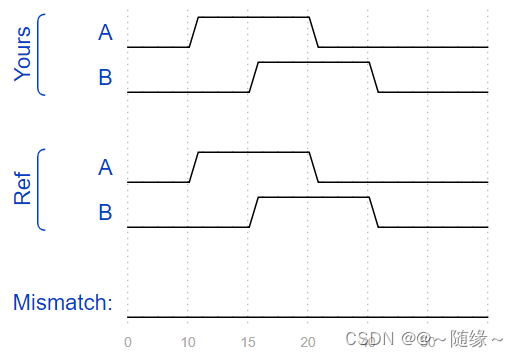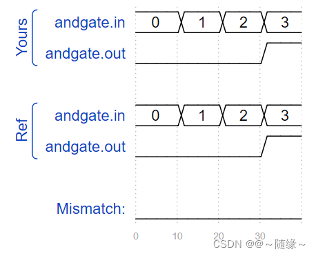 Write a testbench that instantiates this AND gate and tests all 4 input combinations, by generating the following timing diagram: