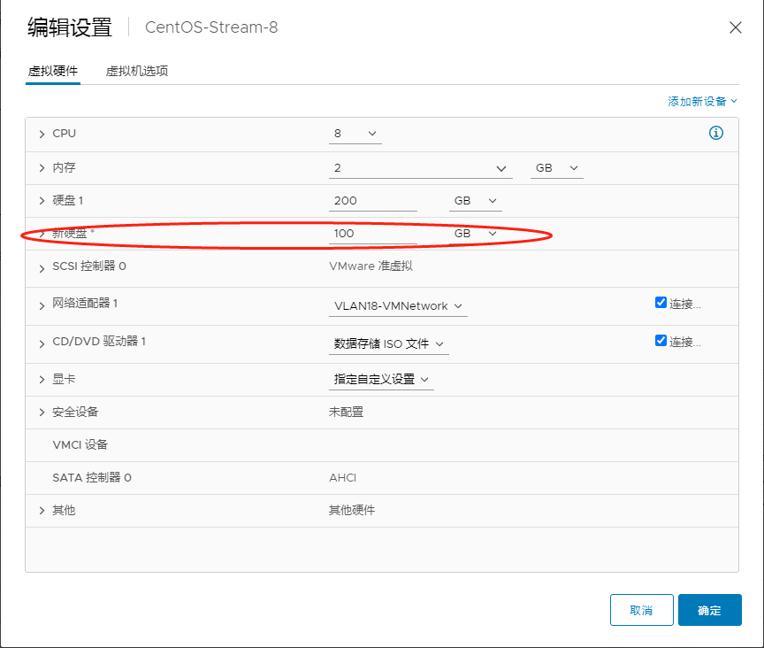 3:在vCenter中找到虚拟机编辑设置,在添加新设备中点击硬盘,添加一个100GB的新硬盘。