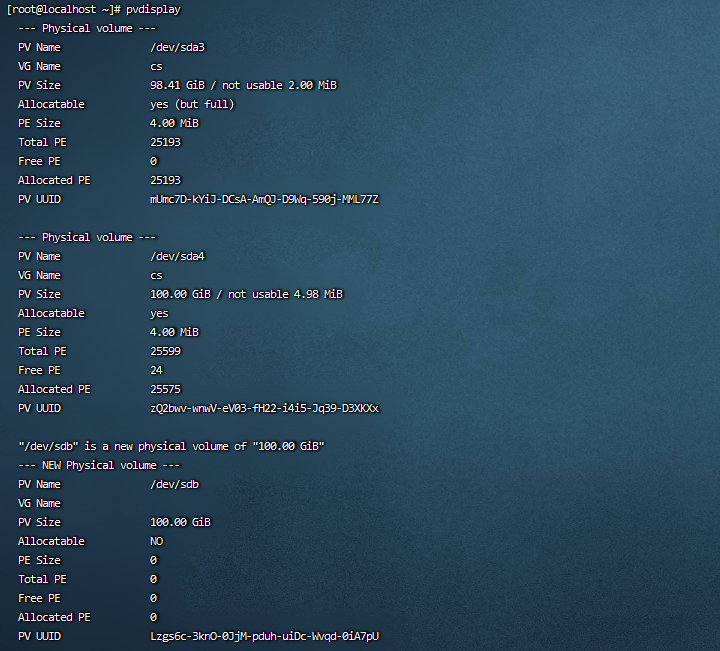 7: 查看物理卷组的信息,记住VG Name的信息。这里的VG Name的信息是cs