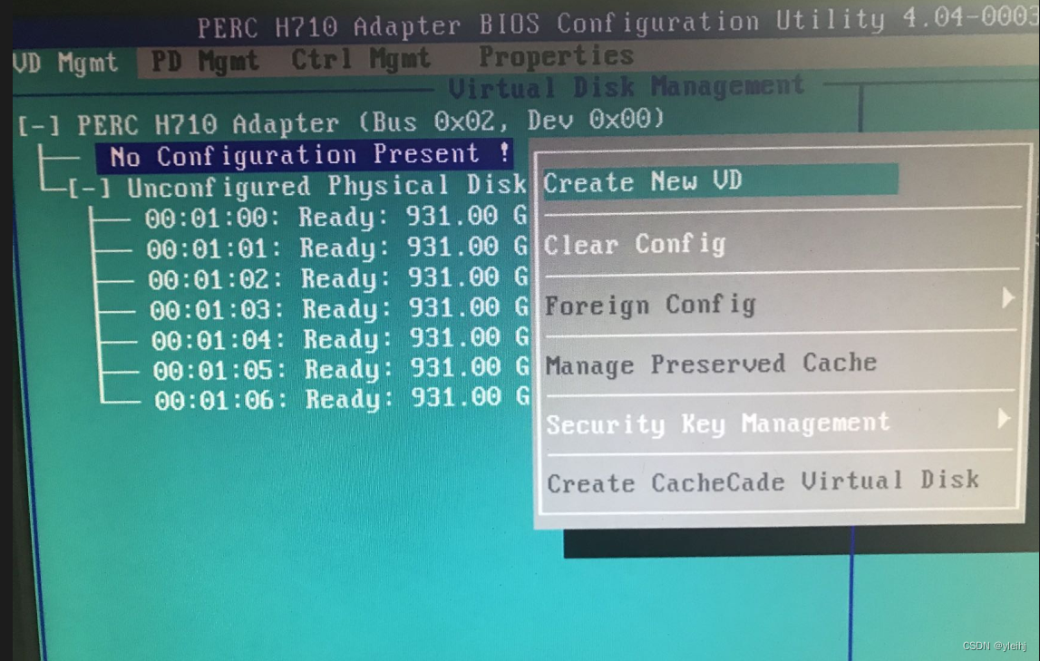 2:选择No Configuration Present,按F2选择Create New VD创建一个新的虚拟磁盘。