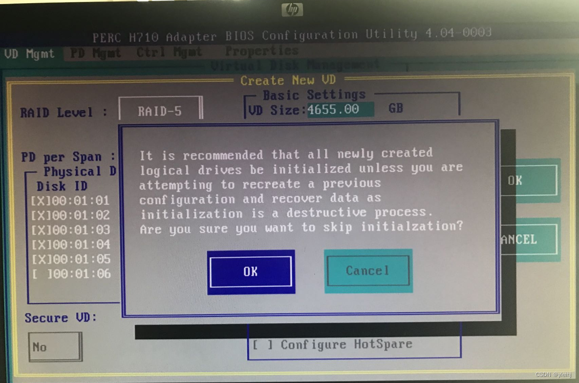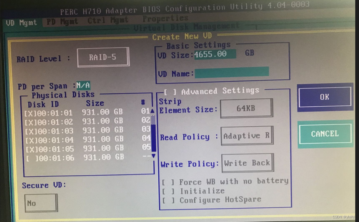 3: Raid Level选择RAID-5,物理磁盘剩余一个其余的都选,然后选择OK.。做Raid5最少要三块硬盘,要是做热备盘就最少需要四块硬盘。