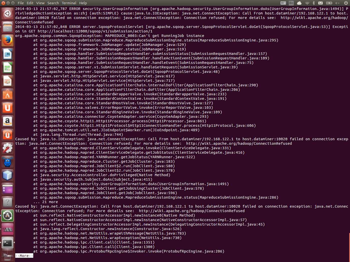 1.启动sqoop.sh server start 时,服务器不能启动,查看sqoop.log发现配置的hadoop目录不是正确的目录或权限不正确.我仔细检查了路径,绝对正确.上网GOOGLE也没有找到解决办法,仔细回想,原来我将sqoop server安装到与hadoop namenode/resourcemanager相同的机子上,而配置的hadoop配置目录是解压后etc/hadoop这个目录,当hadoop运行时,也会用到这个目录,会对这个目录进行保护,所以sqoop无权限读取这个目录的配置文件,想通原因后,解决方法很简单:将etc/hadoop目录下的文件拷贝到/home/zhj/hadoopconf目录,再修改sqoop server的配置便可.