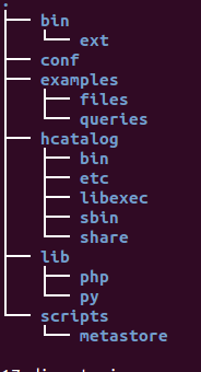 bin/: contains executable scripts that launch various Hive service, including the hive command-line interface(CLI)