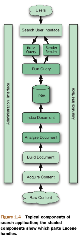 Lucene provides an API for building fields and documents, but it doesn’t provide any logic to build a document because that’s entirely application specific. It also doesn’t provide any document filters, although Lucene has a sister project at Apache,Tika, which handles document filtering very well (see chapter 7). If your content resides in a database, projects like DBSight, Hibernate Search, LuSQL, Compass, and Oracle/Lucene integration make indexing and searching your tables simple by handling the Acquire Content and Build Document steps seamlessly.