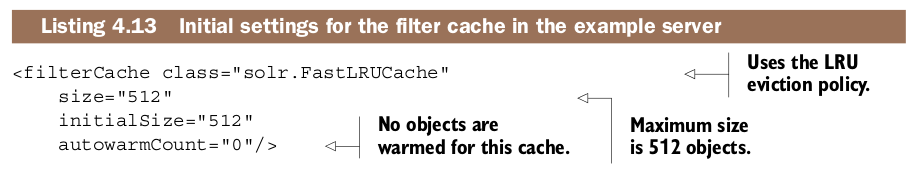 You have to set a maximum size for Solr caches; but this doesn’t affect the size of each individual entry in the cache. As you can imagine, a result set holding millions of documents in the cache would greatly impact available memory in Solr. The <queryResultMaxDocsCached> element allows you to limit the