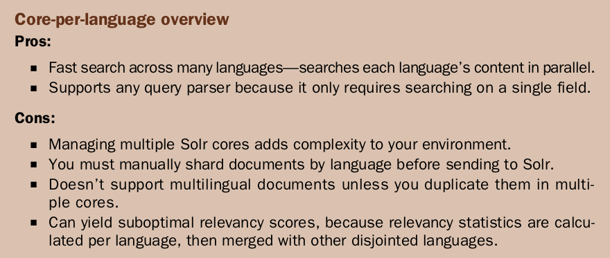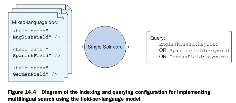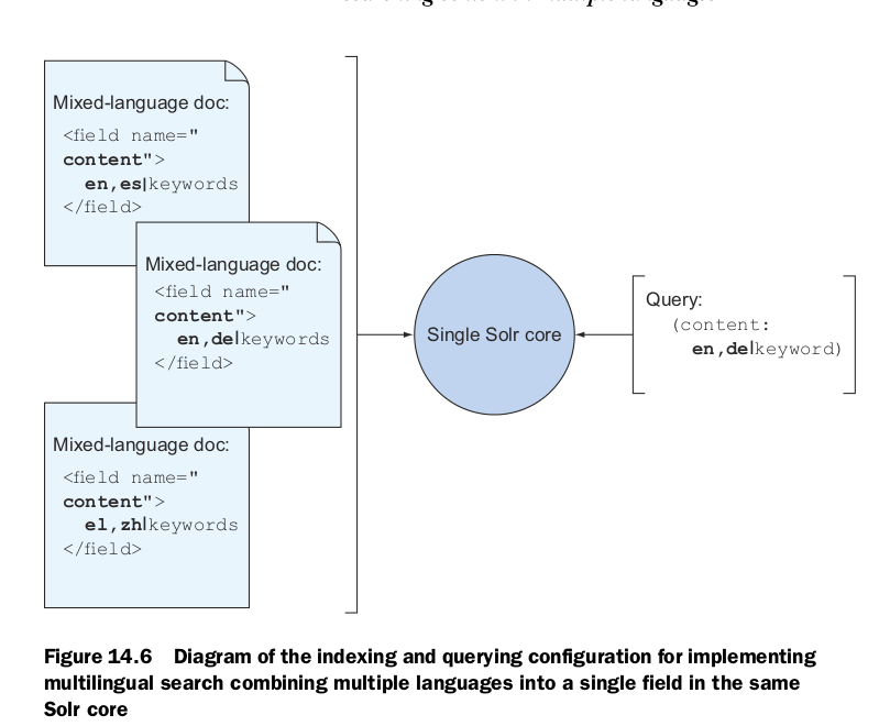 - Use multiple Solr indexes containing the same field name, with each index having the field configured to handle a different language.