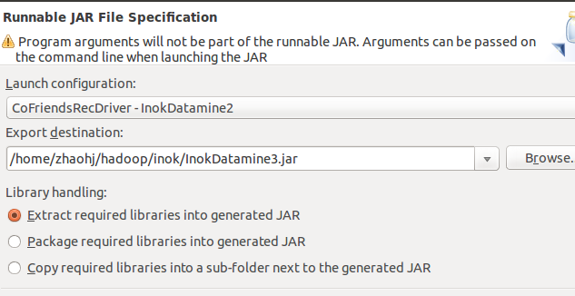 2.If I export my application jar from eclipse with option including the thrid party jars in the jar's lib dir, hadoop still