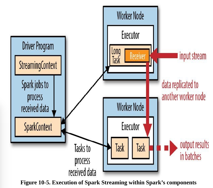 Spark Streaming uses a “micro-batch” architecture, where the streaming computation is treated as a continuous series of batch computations on small batches of data. Spark Streaming receives data from various input sources and groups it into small batches. New batches are created at regular time intervals.At the beginning of each time interval a new batch is created,and any data that arrives during that interval gets added to that batch.At the end of the time interval the batch is done growing.The size of the time intervals is determined by a parameter called the batch interval.