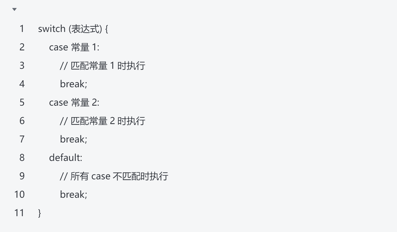 default 是可选分支,当所有 case 都不匹配时执行,类似 if 语句的最后一个 else,常用于处理异常情况: