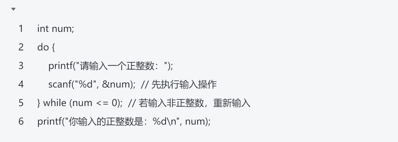 这个场景中,无论用户第一次输入是否正确,“输入操作” 至少会执行一次,这是 while 循环无法直接实现的。