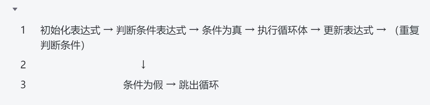 - 更新表达式:每次循环体执行完毕后执行,用于改变循环变量(如i++)。