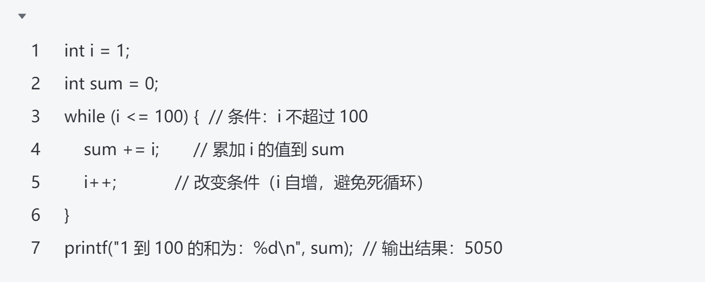 - 条件表达式:每次执行循环体前判断,决定是否继续循环(如i <= 100);