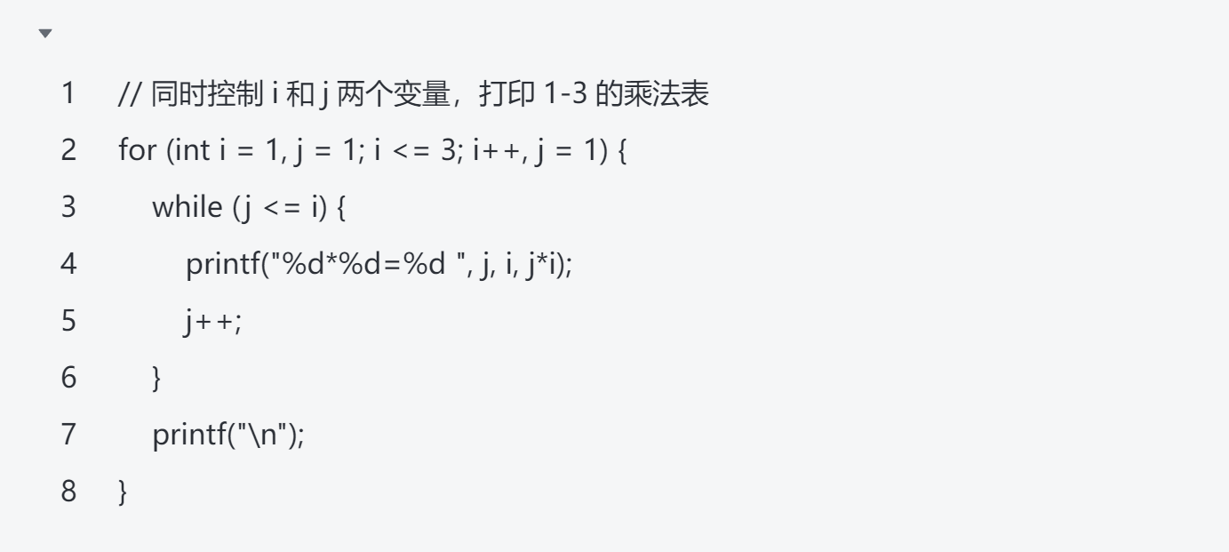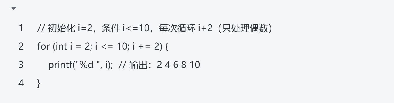 多变量控制:初始化和更新表达式可包含多个语句(用逗号分隔),适合复杂循环逻辑: