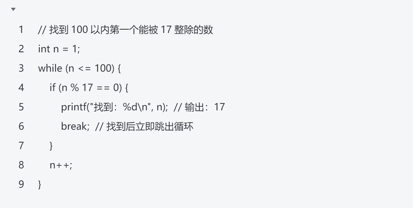 - break:立即终止当前循环,跳出循环体,执行循环外的后续代码。