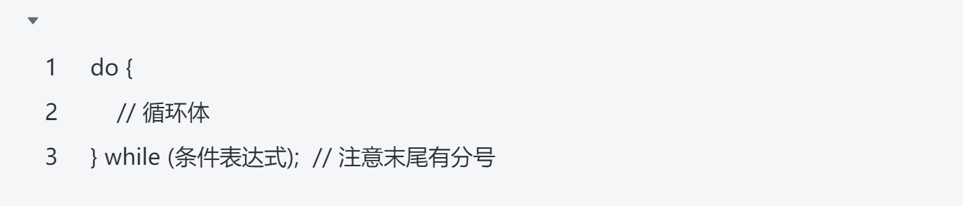 do-while 循环与前两种循环的核心区别是:循环体至少会执行一次,适合 “需要先执行再判断” 的场景(如用户输入验证)。