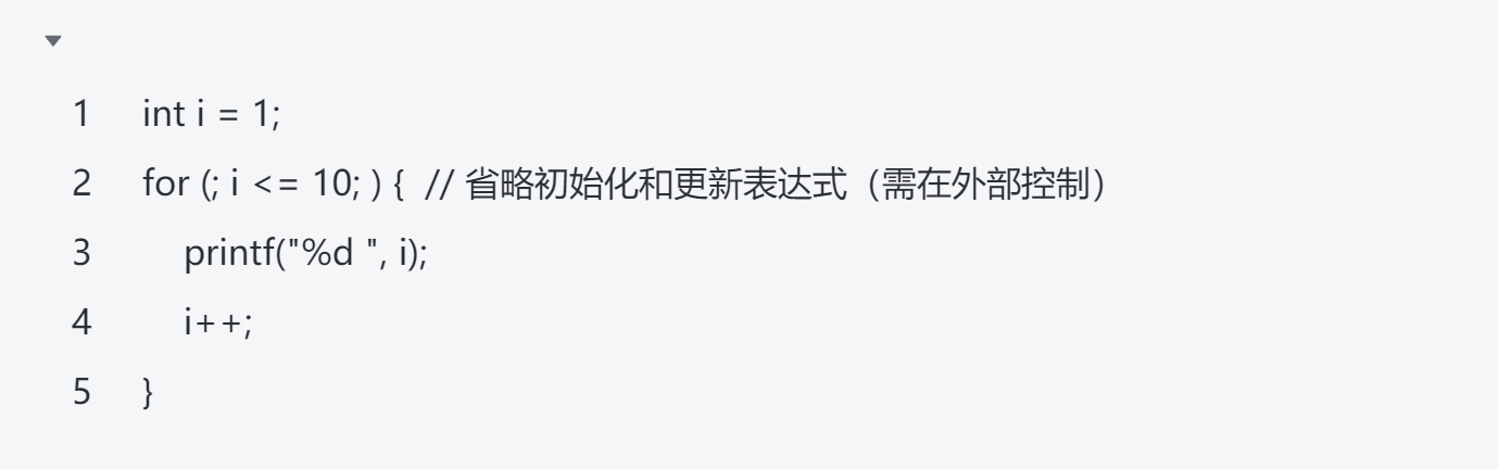 - 表达式可省略:for 循环的三个表达式均可省略,但分号;必须保留。例如: