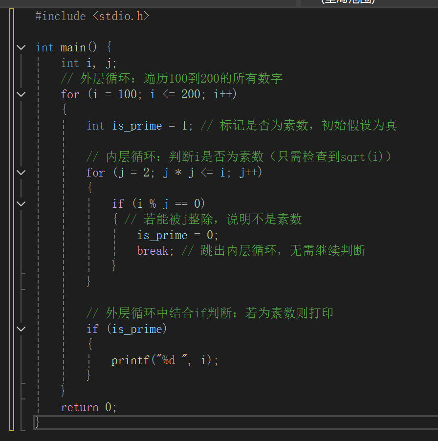 核心逻辑:用外层循环遍历 100~200 的数字,内层循环结合 if 条件判断该数字是否为素数。