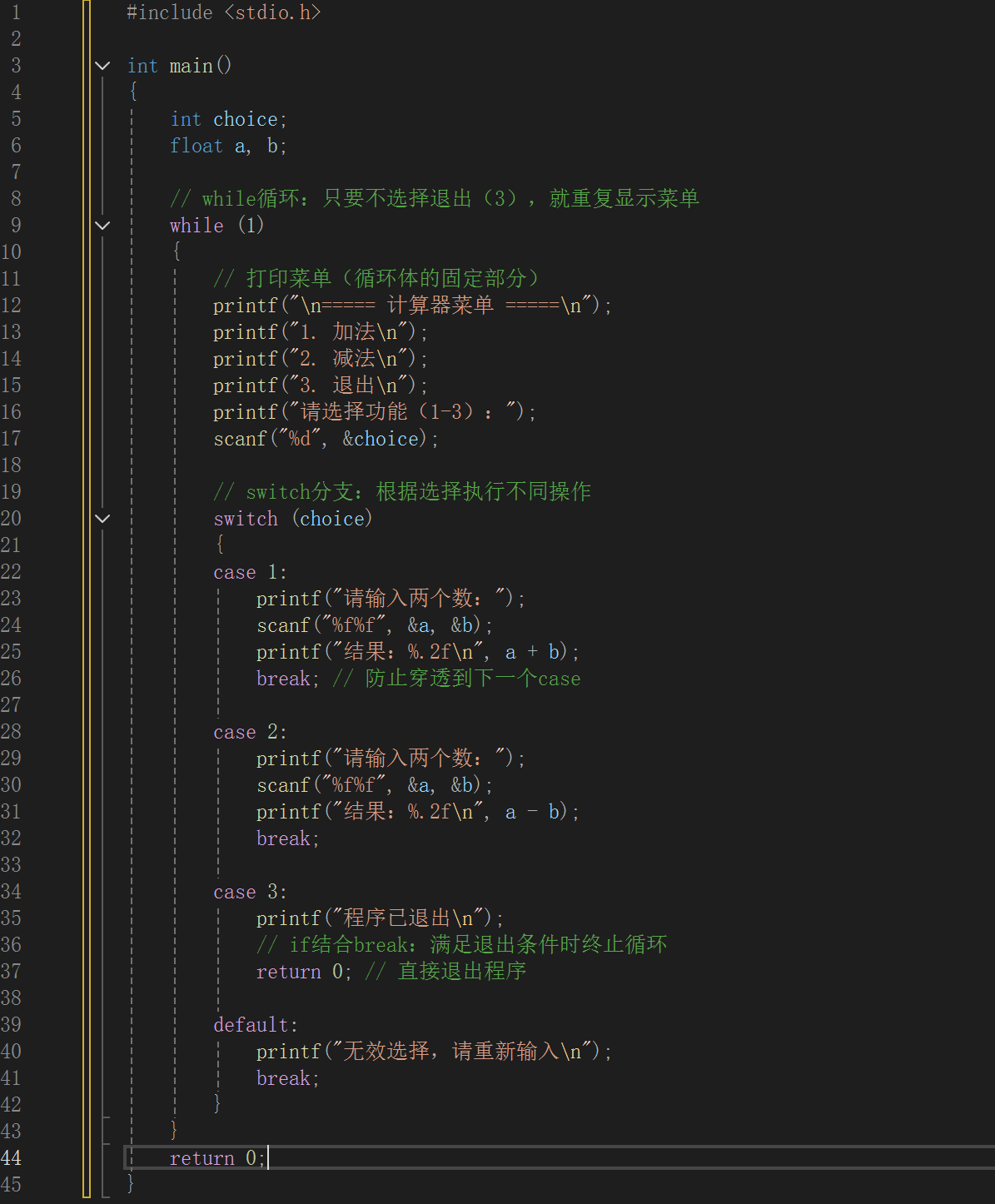 - while(1)创建无限循环,让菜单持续运行,直到用户主动退出;
