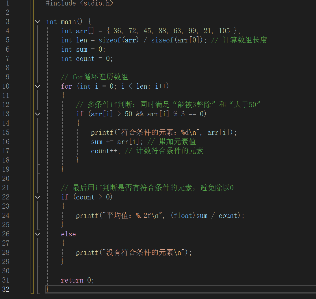 核心逻辑:用 for 循环遍历数组,用 if 多条件判断筛选元素,同时累加符合条件的元素和计数。