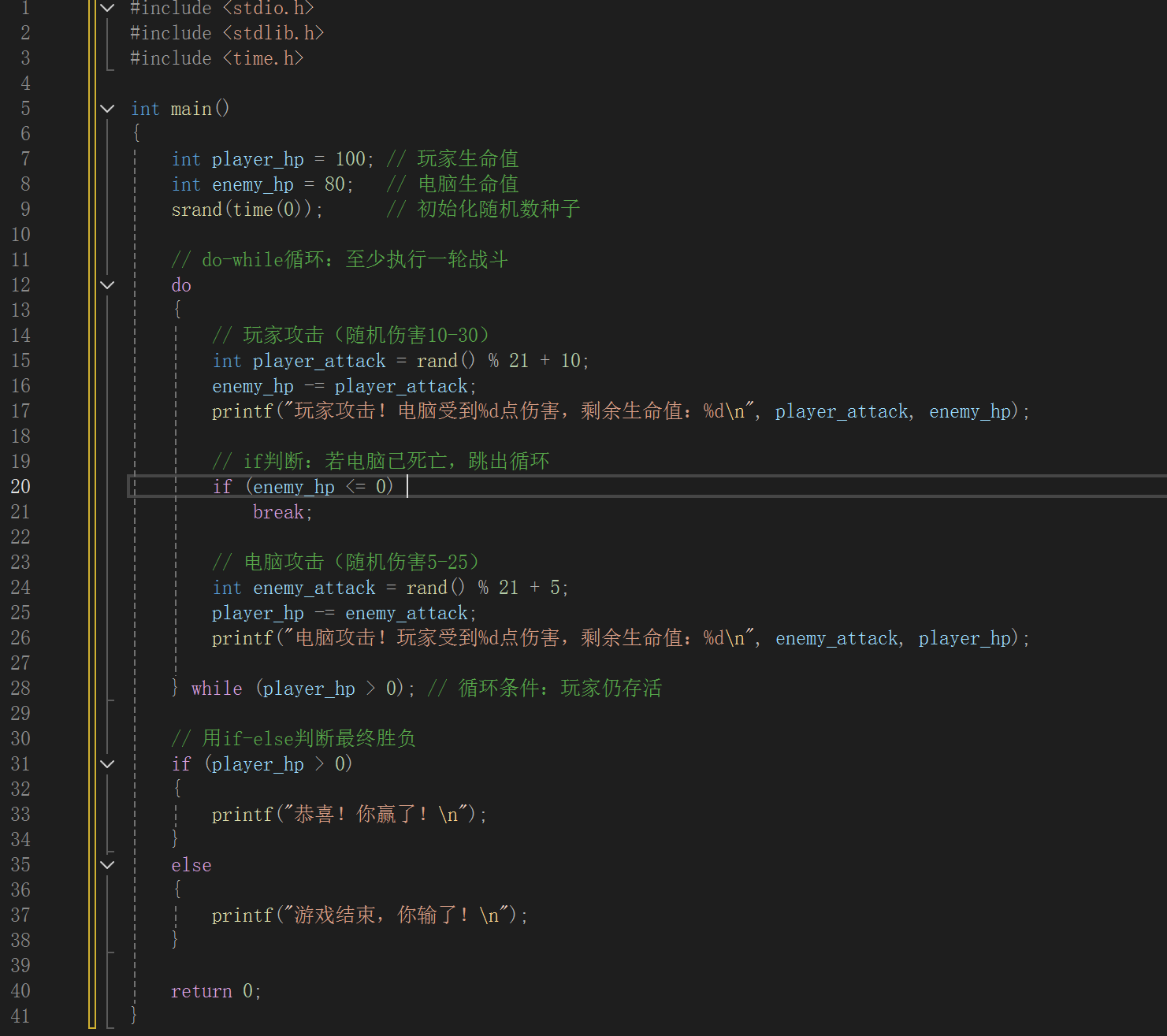 - do-while 循环确保 “玩家先攻” 的逻辑(至少执行一次玩家攻击);
