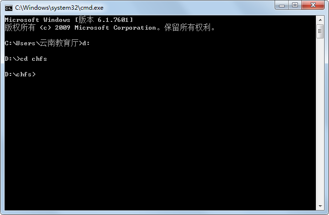 2). 在光标闪烁处接着输入cd chfs并回车(注意cd后加个空格),切换到d盘的chfs目录;