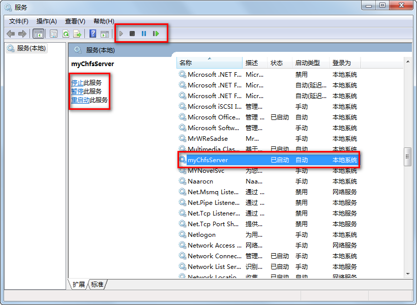 2. 设置:点击任务管理器右下角的“服务”按钮,就会打开任务管理器的设置界面,在这里你可以对自己封装的服务程序进行“启动”、“暂停”、“关闭”等操作。如下图所示: