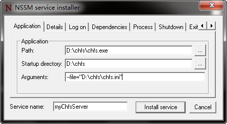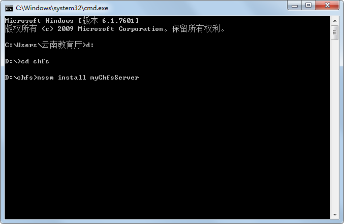3). 在光标闪烁处接着输入nssm install myChfsServer,如下图: