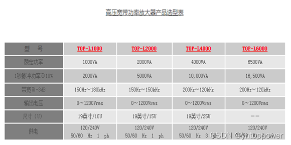 TOP-L系列高压宽带功率放大器产品具有:高性能、大功率、模块化、宽频率、智能化等特点。具备完善的保护功能,在发生输入电源过压、输出过流、过温以及超频时均能实现自动保护和故障状态指示。该系列产品均具备远程监控及操作功能。同时,该系列产品采用全彩触摸屏控制,具有简洁的的人机操作界面,操作简便。