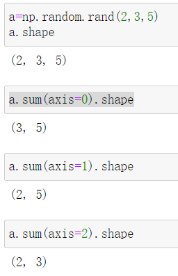 所以,如果输入数组a的维度是3,shape是 (2,3,5) ,numpy.sum(a, axis=0)返回的数组shape是 (3,5) ,numpy.sum(a, axis=1)返回的数组shape是(2,5),numpy.sum(a, axis=2)返回的数组shape是 (2,3) 。