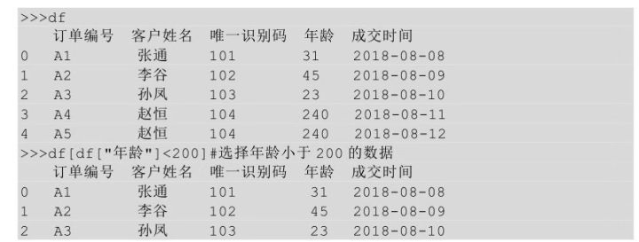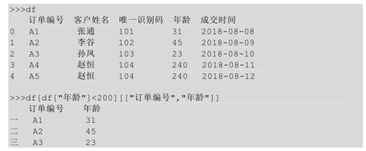 上面的代码表示选择年龄小于200的订单编号和年龄,先通过布尔索引选择出年龄小于200的所有行,然后通过普通索引选择订单编号和年龄这两列。