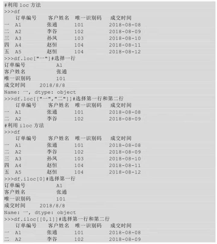 在Python中,获取行的方式主要有两种,一种是普通索引,即传入具体行索引的名称,需要用到loc方法;另一种是位置索引,即传入具体的行数,需要用到iloc方法。