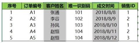 在Excel中选择某一列直接用鼠标选中这一列即可;如果要同时选择多列,且待选择的列不是相邻的,这个时候就可以先选中其中一列,然后按住Ctrl键不放,再选择其他列。举个例子,同时选择客户姓名和成交时间这两列,如下图所示。
