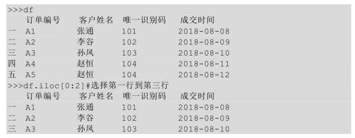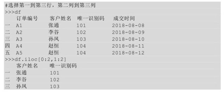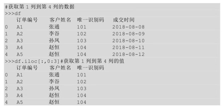 在上面的代码中,iloc 后的方括号中逗号之前的表示选择的行,当只传入一个冒号时,表示选择所有行;逗号后面表示要选择列的位置区间,0:3表示选择第1列到第4列之间的值(包含第1列但不包含第4列),我们把这种通过传入一个位置区间来获取数据的方式称为切片索引。