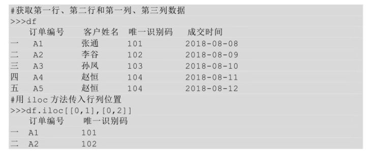 在 iloc 方法中的第一对方括号表示行索引的选择,传入要选择行索引的位置;第二对方括号表示列索引的选择,传入要选择列索引的位置。行和列索引的位置都是从0开始计数。