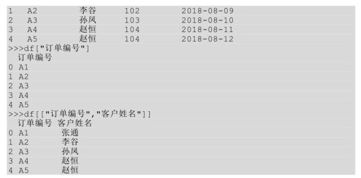 在Python中我们要想获取某列只需要在表df后面的方括号中指明要选择的列名即可。如果是一列,则只需要传入一个列名;如果是同时选择多列,则传入多个列名即可,多个列名用一个list存起来。