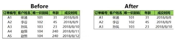 筛选年龄小于200的数据前后的对比如下图所示。