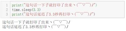 time库中最常用的方法还有time.sleep(),比如,如果我们想要程序等待3.3秒之后再输出,可以写time.sleep(3.3)