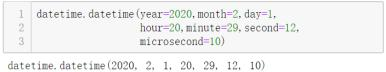 创建datetime.datetime类对象的方法和datetime.time类也是基本一致的,参数包含year、month、day、hour、minute、second、microsecond。 但是至少要包含year、month、day三个参数。