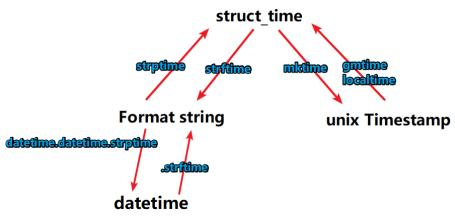 确实,使用Python写爬虫等程序时,时常需要用到time库与datetime库中的各种时间对象,最为头疼的地方往往是各种时间格式转换。其实,在了解time库和datetime库的各种类和属性方法后,记住下面这张图可以事半功倍: