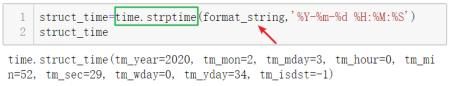 而如果我们想要将字符型的时间转化为struct_time对象,可以用time.strptime()方法,格式刚好与time.strftime()方法对应。