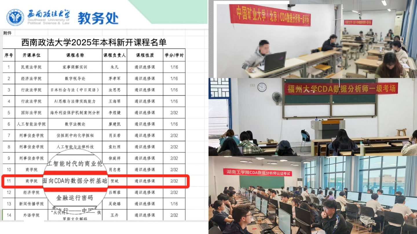 西南政法大学在5月份将CDA数据分析师认证课程纳入学分体系,开设为期一学期的2学分选修课。这是CDA认证体系在政法类院校的首次落地,旨在培养既精通法学专业又掌握数据分析能力的复合型人才,适应"智慧司法"等新兴领域的需求。