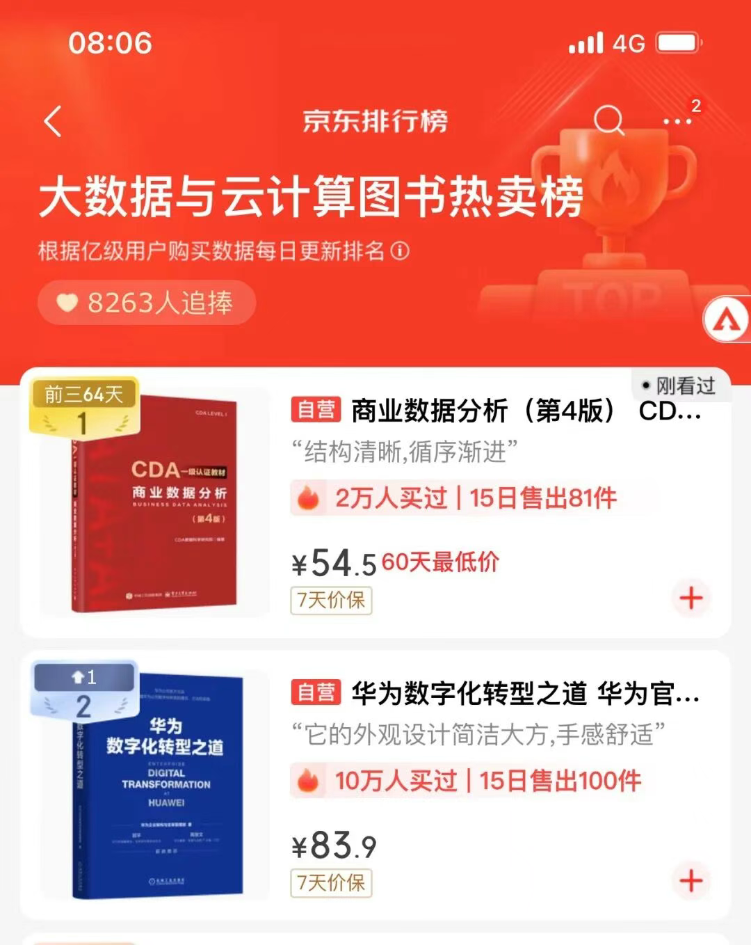 作为CDA认证体系的重要组成部分,《CDA商业数据分析(第4版)》近期在京东图书热销榜位居前列,反映了社会对高质量数字化教育资源的迫切需求。