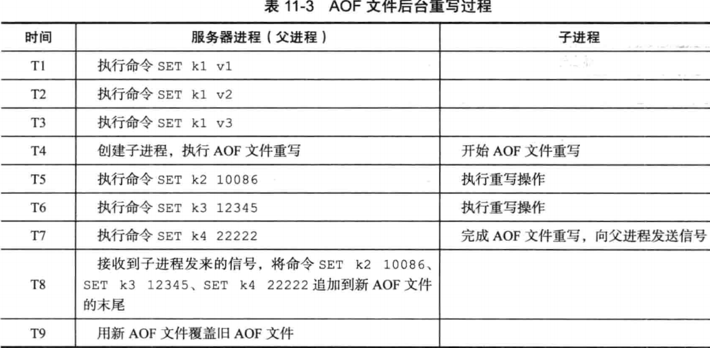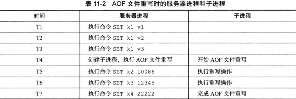 表11-2,重写后的AOF文件和服务器当前的数据库状态并不一致,新的AOF文件只保存了K1一个键的数据,而服务器数据库现在却有k1,k2,k3,k4四个键。
