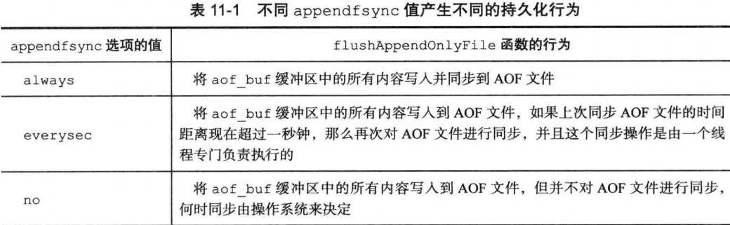 flushAppendOnlyFile()flushAppendOnlyFile函数的行为由服务器配置的appendfsync选项的值来决定,各个不同值产生的行为如表11-1所示。